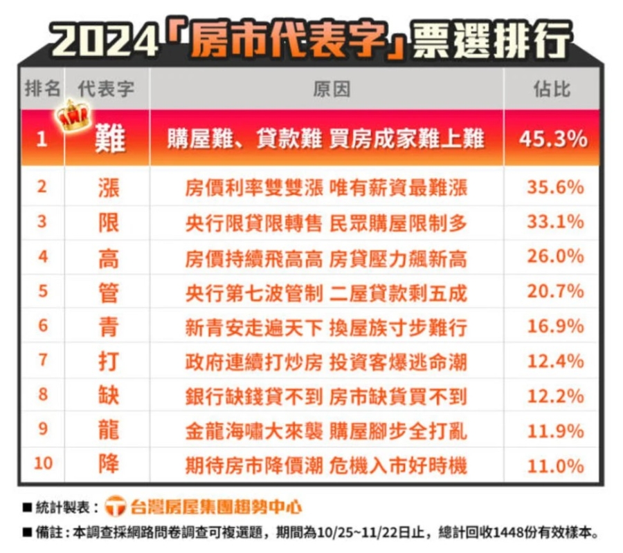 “難”字獲選台灣2024年房市代表字。(圖源:台灣房屋集團趨勢中心)