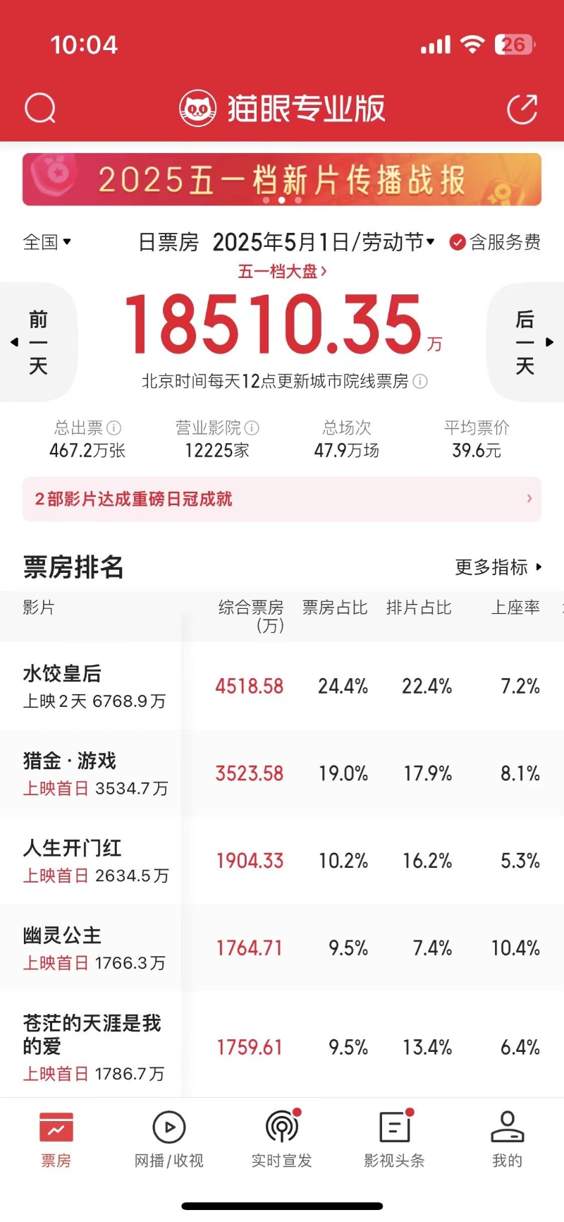 2025年“五一”勞動節假期首日票房(5月2日10時數據)。圖源:貓眼專業版