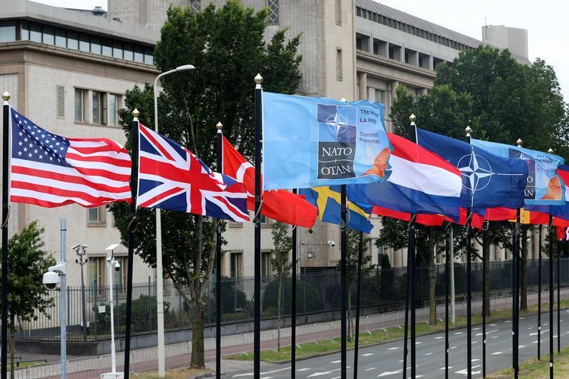 這是6月24日在荷蘭海牙的北約峰會現場拍攝的北約及其成員國旗幟。圖源:新華社