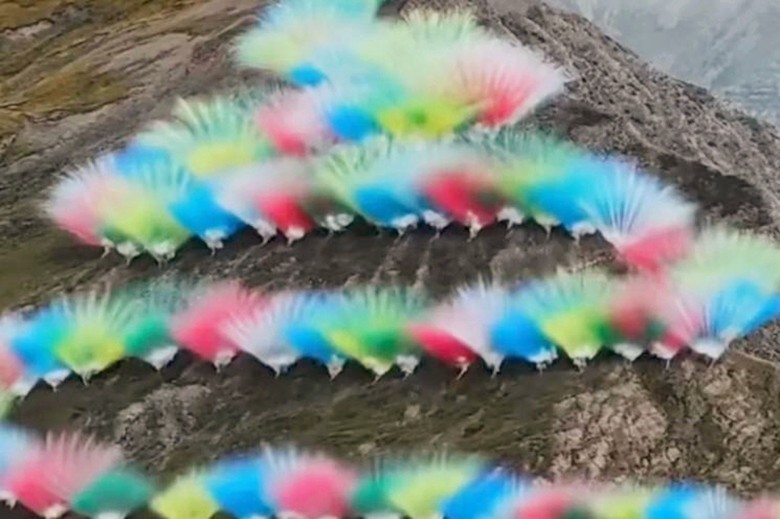 始祖鳥9月19日聯手蔡國強在喜馬拉雅山放煙火。現場視頻顯示,蔡國強通過火藥爆破在山脊點燃三幕煙花,形成“升龍”動態景觀。廣告方視頻截圖