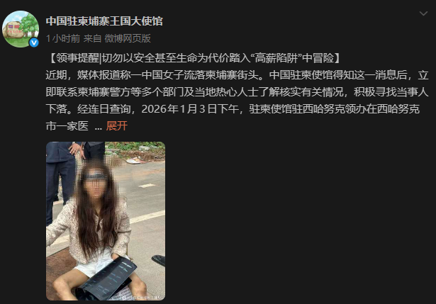 香港中通社1月4日電 中國駐柬埔寨大使館4日發布消息,證實近日成功尋獲並救助一名因輕信“高薪工作”誘騙流落柬埔寨街頭的中國吳姓女子,目前正協助其家屬辦理回國手續。